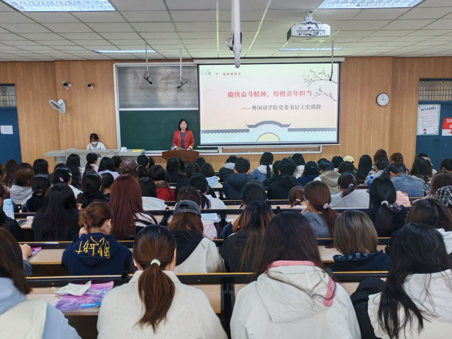 本期文化讲堂以“赓续奋斗精神,厚植青年担当”为主题,围绕“六个一”为中心内容开展,分为“学精神”、“观短片”、“诵经典”、“谈感悟”、“吟歌曲”、“送祝福”六个环节。活动伊始,王宏书记带领同学们学习领会习近平新时代中国特色社会主义思想,并对同学们提出了三点希望:一是“天行健,君子以自强不息”,希望同学们能够保持发愤图强、刚毅坚卓的拼搏精神,将个人理想融入民族复兴伟业。二是“不日新者必自退”,希望同学们能够保持永不停歇、终身学习的进取精神,汲取知识力量,练就过硬本领。三是“君子以细行律身”,希望同学们保持严以律己、以身作则的自律精神,以更加优秀的自己迎接未来的挑战。随后国家奖学金获得者苍含月向同学们分享了学习经验,讲述自己为实现梦想不断努力的拼搏过程。在场师生一同观看了励志短片《奋斗者正青春》,学生代表彭逸纯同学诵读经典诗歌《青春的征程》,2023级优秀学生代表吴倩同学结合此次活动主题分享个人的感想与思考,鼓励同学们“锲而不舍,金石可镂 ”,只要坚定信念、勇往直前,一定能收获成长。接着同学们共同歌唱《逐空》,在歌声中,大家一同追寻青春的脚步。最后,通过向同学们分发明信片,让大家亲手写下对未来的期许,把梦想的种子埋在这美好的时刻,期待它在未来生根发芽。