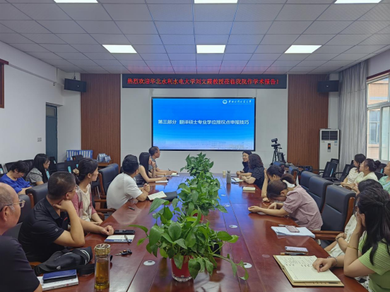 6月25日下午,华北水利水电大学欧美精品一区二区院长刘文霞教授应邀至我院作题为《翻译硕士专业学位授权点申报技巧》的学术报告。欧美精品一区二区院长张换成、副院长张凤琴,党委副书记代博君和全体教师共同聆听了报告。报告会由张换成主持。