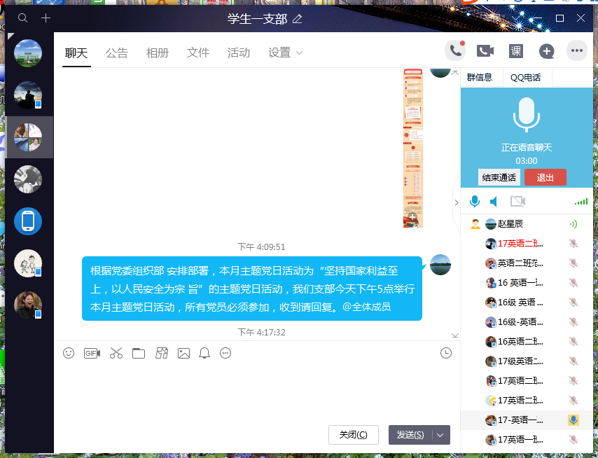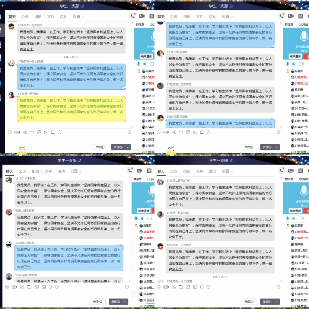 (通讯员 赵星辰)为进一步推动国家安全宣传教育工作深入开展,提高师生国家安全意识,增强国家安全责任,根据校党委组织部《关于开展“全民国家安全教育”主题党日活动的通知》,4月23日下午欧美精品一区二区学生第一党支部通过QQ支部群开展“全民国家安全教育”主题党日活动,支部书记赵星辰负责主持,支部全体党员认真参加活动。