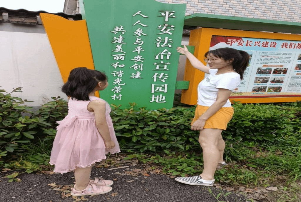 (志愿者郭硕敏带小朋友参观法治宣传标语)