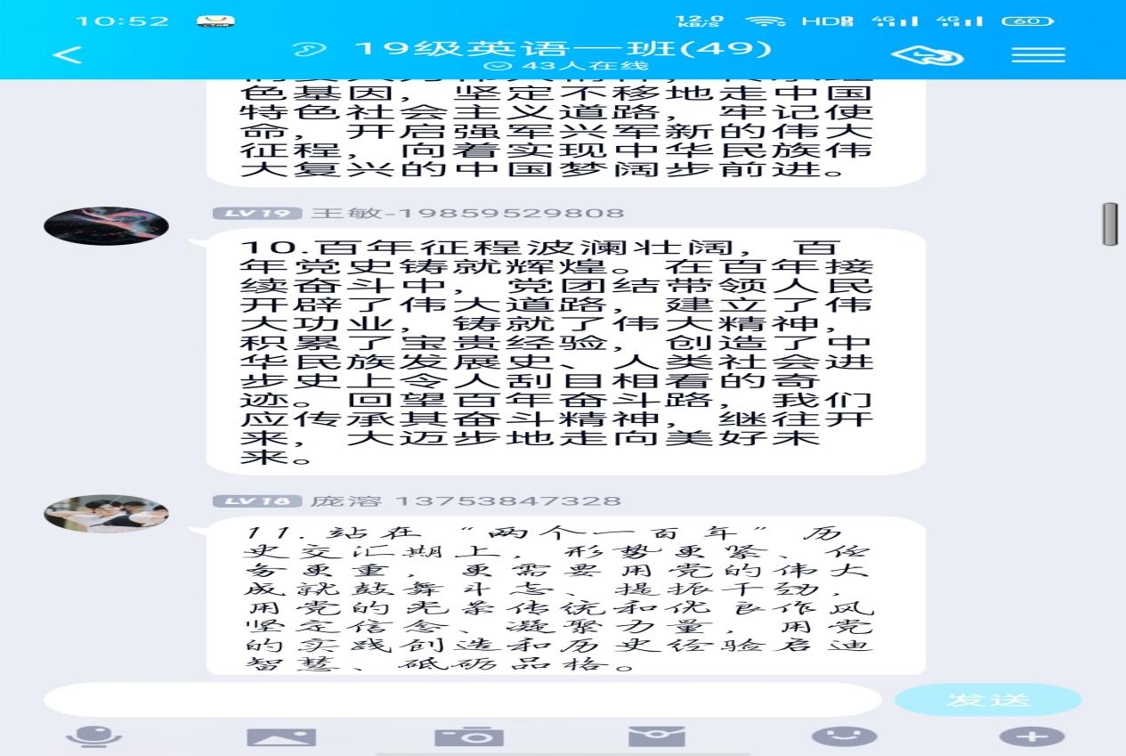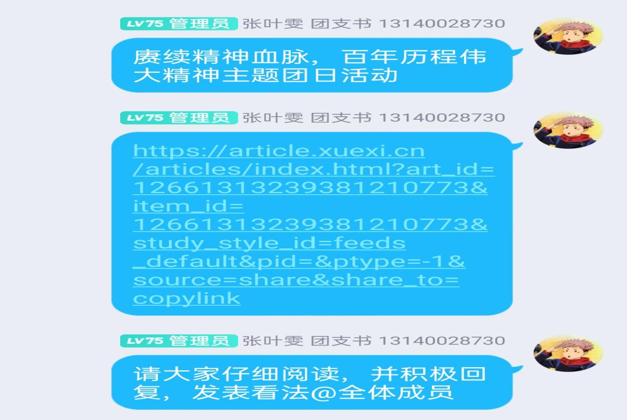 2021年9月3日是中国人民抗日战争暨世界反法西斯战争胜利76周年纪念日。1314191团支部在团支书的带领下重温了习近平总书记阐述抗战伟大胜利意义的讲话,团员们线上积极发表个人体会感悟;“青年大学习”网上团课是“三会两制一课”的重要环节之一,是带领全体共青团员学习团课的必要性会议。1324201团支部的同学们共同观看了网上示范团课,积极在团支部线上qq群发表自己观看团课后的心得体会;时值九月教师节的来临,1324202团支部的团员们自发组织开展对老师的感恩活动,制作海报,手写寄语,把尊师重道的品德和氛围发挥到良好。