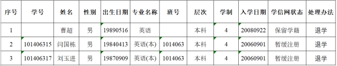 根据学校相关规定,现我院决定对曹超等3名学生(后附名单)给予退学处理。