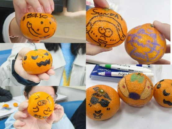 活动伊始,教室里洋溢着轻松愉悦的氛围,现场准备了充足的橘子和多彩的涂鸦工具,每位同学领到橘子后,都尽情挥洒创意,在橘子上进行涂鸦创作,有的同学画上了趣味表情,寓意着积极向上的精神,有的同学则画上了自己喜爱的卡通形象,展示着个人的独特兴趣,还有的同学选择画上一些抽象的图案,传递着他们的奇思妙想,一笔一画间都能让情感与灵感在指尖流淌。随后大家围坐在一起,互相欣赏和讨论着各自的橘子作品,不少同学都分享了自己的创作灵感和涂鸦背后的故事,将这份个人的小确幸传递给每一位倾听者,彼此交换感悟,让心灵的触动持续升温。