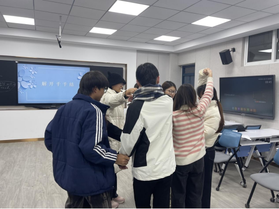 首先,成员们进行了热身活动“滚雪球”,大家围坐成一圈依次进行自我介绍,后一个人要先重复前一个人的信息然后再继续介绍自己。这个环节能够快速帮助团体成员之间互相认识彼此,建立初印象。接下来,在“撕纸游戏”环节中,成员们闭上眼睛,根据老师发出的单项指令,对纸张进行操作,通过这个活动,同学们能直观感受到单向沟通和双向沟通产生的不同结果,理解沟通过程的复杂性,深刻体会到在沟通时清晰表达和准确理解的重要性,也有助于帮助同学们在人际交往中尊重每个人不同的思维方式。最后一个活动叫做“解开千千结”,大家站起来先手拉后围成一个圈,随后跟着音乐随意走动打乱站位,当音乐停止的时候,大家立刻停下脚步,迅速寻找自己原来左右两边的同学,重新拉住手,此时,形成了一个看似错综复杂的“结”,在不松开手的前提下,大家需要共同努力解开这个“结”,使其恢复成一个完整的圆圈。同学们在活动中全情投入,共同尝试不同的方法,成功解开“结”后的喜悦、兴奋之情洋溢在每个人的脸上,大家深刻体会到团结合作也是构建和谐人际关系必不可少的一部分。