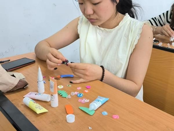 活动当天,心理部精心准备了丰富多样的奶油胶,搭配形态各异的小装饰,有萌趣卡通形象、精致蝴蝶结、闪亮小钻石等等,同学们可以根据自己的喜好自由挑选。挤奶油胶的过程是一场沉浸式的心灵SPA,大家全神贯注地投入到创作中,将奶油胶挤出勾勒线条、搭配色彩、填充图案,并摆放可爱的小装饰,当一个个独一无二的发卡逐渐成型,同学们脸上洋溢着满满的成就感和喜悦。大家围坐在一起,一边制作,一边交流创作心得,在创作的乐趣中,暂时忘却烦恼。