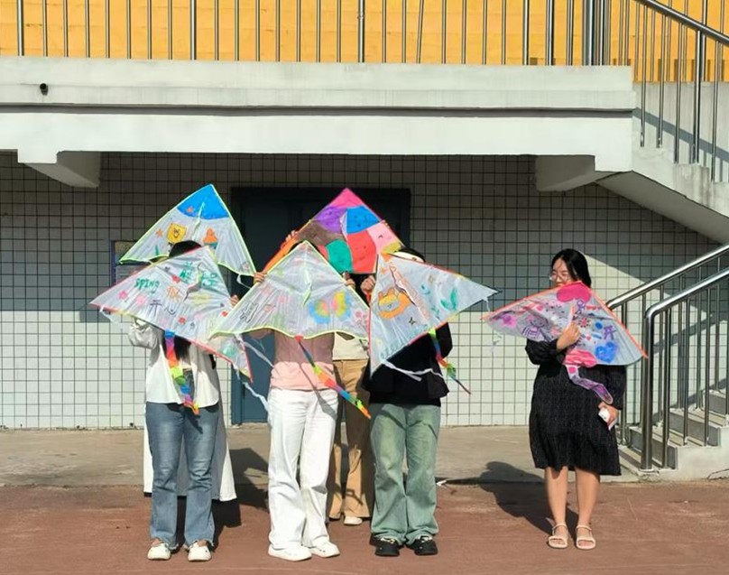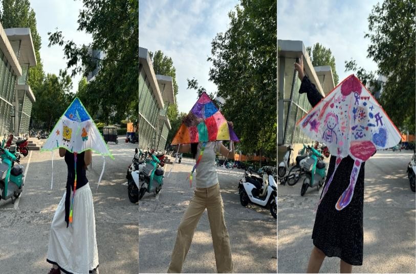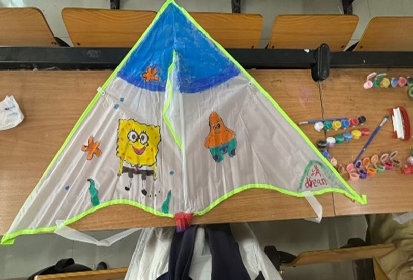 活动当天,同学们先围坐在教室里,一起充分发挥想象力和创造力,在空白的风筝上调色、勾线、填色,有人绘制了憨态可掬的卡通形象,有人用绚丽的色彩描绘了心中的春日盛景,还有人在风筝上写下春日寄语,每一只风筝都承载着独一无二的创意,小小的教室俨然成了艺术的海洋。心理部成员适时引导同学们通过色彩的选择与搭配表达情绪,将DIY过程转化为自我探索与心里疗愈的过程。